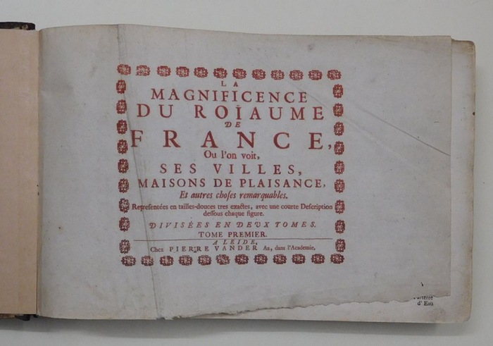 La magnificence du roiaume de France, ou l'on voit ses villes, maisons de plaisance et autres choses remarquables representées en tailles-douces tres exactes, avec une courte Description dessous chaque figure. Divisées en deux tomes. 2 Teile in 1 Band. Pieter van der Aa, Leiden, 1725. Quer-Kl.-4°, Titelblatt in rot (etwas knittrig), Inhaltsverzeichnis sowie 173, teils ausfaltbaren Kupferstich-Tafeln mit Ansichten, Plänen und Karten, restaurierter, goldgeprägter Original-Ganzledereinband. *Atlas / Frankreich / Frankreichatlas (OBM) *Pieter van der Aa, auch Peter van der Aa (* 1659 in Leiden - August 1733 ebenda) war ein niederländischer Buchdrucker, Verleger und Buchhändler.