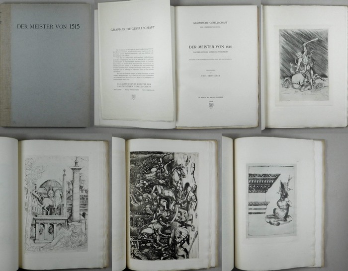 Der Meister von 1515. Nachbildungen seiner Kupferstiche. Berlin, Bruno Cassirer, 1916. Folio. 8 S. Text und 36 (recte 37) Tafeln in Kupfertiefätzung und ein Lichtdruck mit 47 Werken. Originalhalbleinwandband. ."raphische Gesellschaft, XXII. Veröffentlichung". - Originalausgabe. - "Als Meister von 1515 (italienisch Maestro del 1515) wird ein Kupferstecher und Zeichner bezeichnet, der Anfang des 16. Jahrhunderts wohl in Italien tätig war. Der namentlich nicht bekannte Künstler erhielt seinen Notnamen nach der auf einer seiner Radierungen angegebenen Jahreszahl 1515. Wegen der von ihm verwendeten Kaltnadel-Techniken auf Kupfer wird als sein Herkunftsland manchmal Deutschland vermutet, da diese Technik im Norden Deutschlands um 1500 entstanden sein kann und er sie dort kennenlernte." (Wikipedia). Beigelegt: Prospekt der Gesellschaft mit dem Verzeichnigs der Publikationen und dem Jahresabschluss und der Kalkulation für das vorliegende Werk. - Die erste grössere Veröffentlichung. - Rücken mit handschriftlichem Titel. Titel und Vorsatz mit kleinem Sammlerstempel.