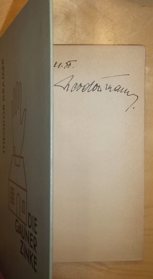 Die Gaunerzinke. Gedichte. Frankfurt, Rütten & Loening, 1929. 64 S. 8°. OLwd. (leicht bestoßen und etw. gebräunt). Erste Ausgabe der ersten Veröffentlichung von Theodor Kramer. - W.-G. 1. - Vorsatz mit eigenhändiger datierter Signatur von Theodor Kramer. - Exlibris. Etw. gebräunt.