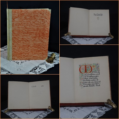Das 13. Kapitel des 1. Korintherbriefes. Ohne Ort, 1939. (29) S. Orig.-Halbpergament mit Buntpapierbezug. Kalligraphische Handschrift auf Büttenpapier, monogrammiert: C. H. S. - Titel und Eingangsinitiale aquarelliert. - Mit Widmung in Bleistift unter dem Kolophon. - Ecken und Kanten gering bestoßen; schönes Exemplar.