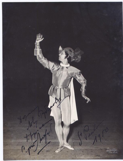 Portraitphotographie mit eigenh. U. Sao Paulo, 1950. 180:240 mm. Serge Lifar, russischer Tänzer, Ballettmeister und Tanztheoretiker; Mitglied von Diaghilews ?Ballets Russes? (1905-1986). Portraitphotographie mit e. Widmung u.U. (russisch) auf der Bildseite, Sao Paulo, 1950, 18 x 24 cm. Photographie: Photo-Lipnitzki, Paris. Ganzfigürliches Rollenbild, mit einer Widmung für Lew Gubanow.