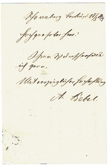 Eigenh. Postkarte mit Unterschrift ?A. Bebel?. [Berlin-]Schöneberg, 28. III. 1913. Kl.-8vo. 1 p. An den Archivrat Krause in Stuttgart, der ihn um ein Autograph gebeten hatte: ?Ihren Wunsch erfülle ich gern. Mit vorzüglicher Hochachtung A. Bebel?. - Bebel war einer der Begründer der deutschen Sozialdemokratie und einer der bedeutendsten Parlamentarier in der Zeit des Deutschen Kaiserreichs. Die sog. Umsturzvorlage war eine am 5. Dezember 1894 in den Deutschen Reichstag eingebrachte Gesetzesvorlage des Reichskanzlers Fürst Chlodwig zu Hohenlohe-Schillingsfürst, die nach ihrer Begründung den gefährlichen, auf den gewaltsamen Umsturz der bestehenden Verfassung und Gesellschaftsordnung des Deutschen Reiches zielenden Bestrebungen entgegentreten sollte. Die hinter diesen Bestrebungen stehenden Kräfte waren nach Meinung der Verfasser der Umsturzvorlage insbesondere die Sozialdemokraten. Am 11. Mai 1895 wurde die Umsturzvorlage in Zweiter Lesung zurückgewiesen.